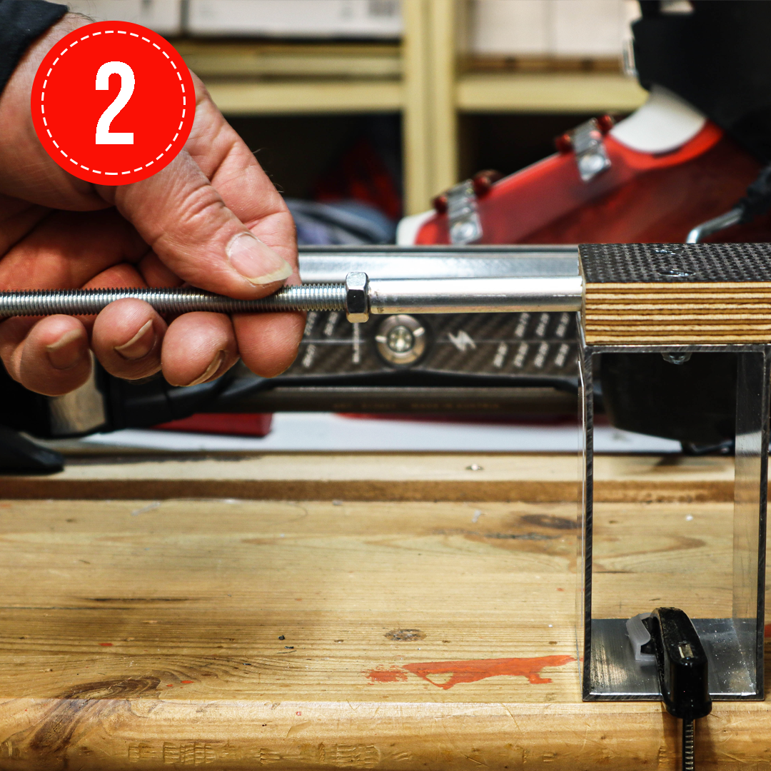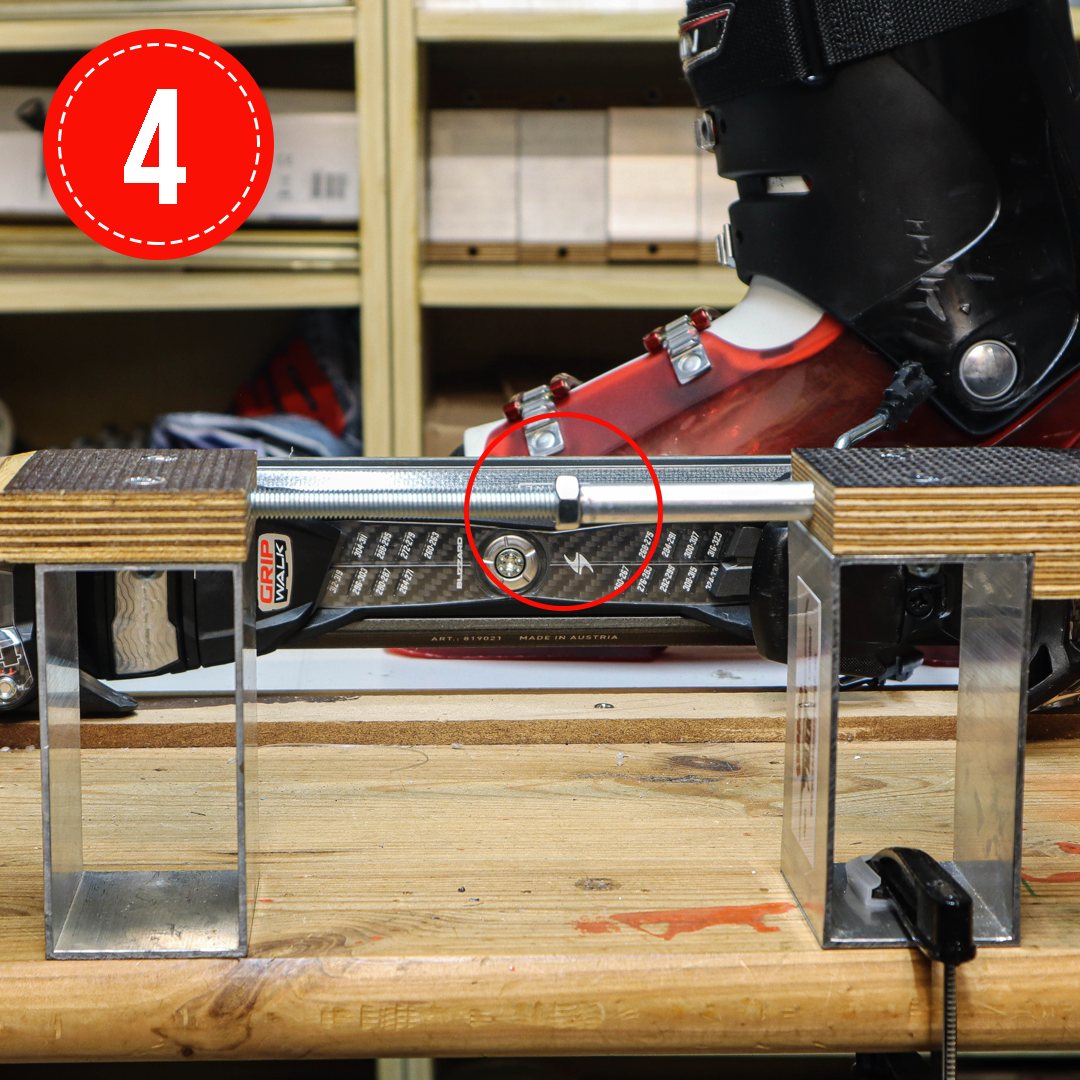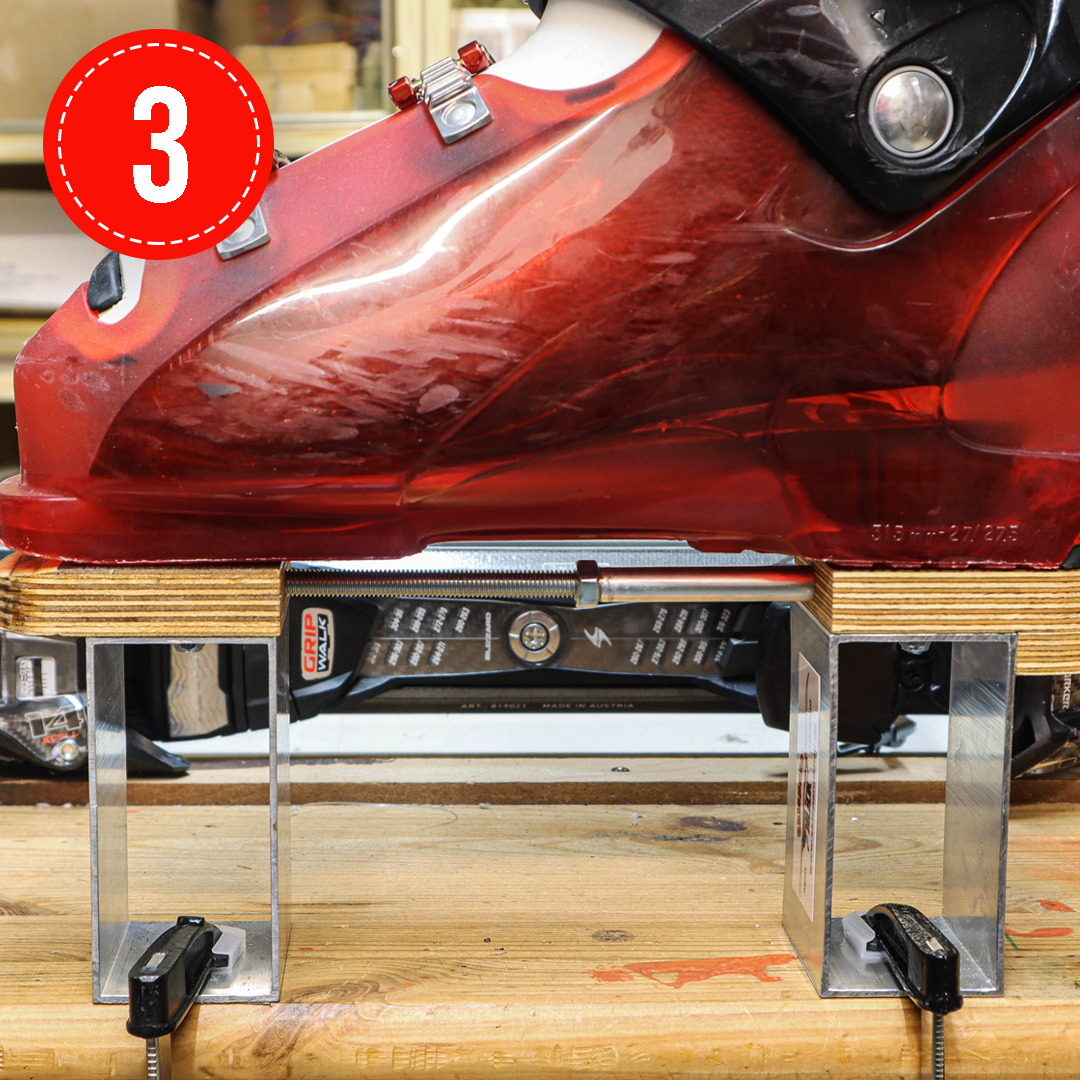 Vorderen Spannblock auf die Gewindestange aufstecken und mit Hilfe des Skischuhs die Länge einstellen. Jetzt diesen mit einer Schraubzwinge befestigen.